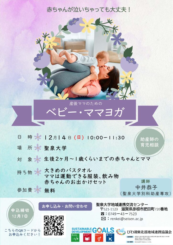 聖泉大学の別科助産専攻の学生と教員が中心となり、乳児とその母親を対象としたヨガ教室を開催いたします。